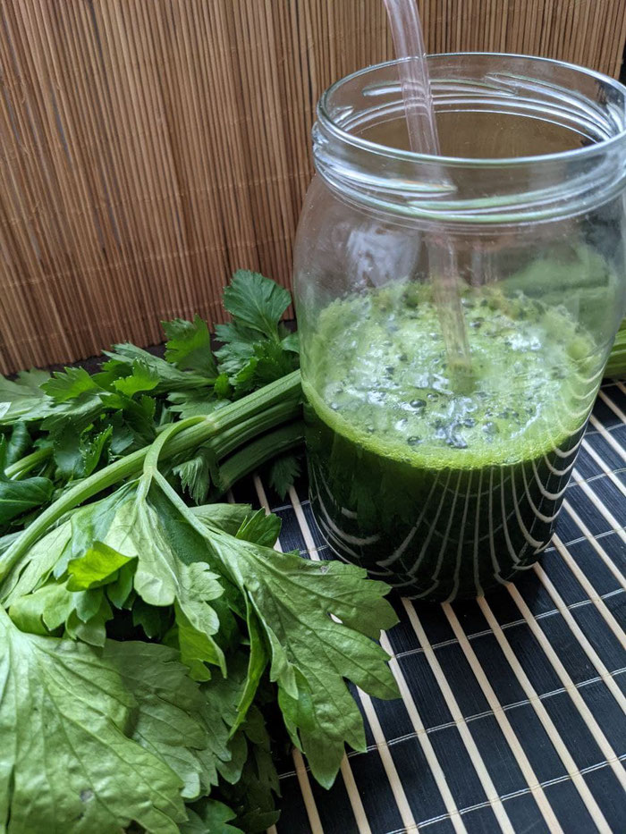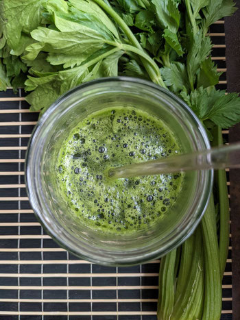 Manchmal trank ich den Saft als weitere Zutat zu anderen grünen Pflanzen. Beispielsweise zu Gurke, Weizengras, Koriander oder Blattspinat. Empfohlen wird jedoch den puren Saft aus Staudensellerie zu trinken. Persönlich mixe ich intuitiv anderes Grün mit hinzu und es bekommt mir auch sehr gut!